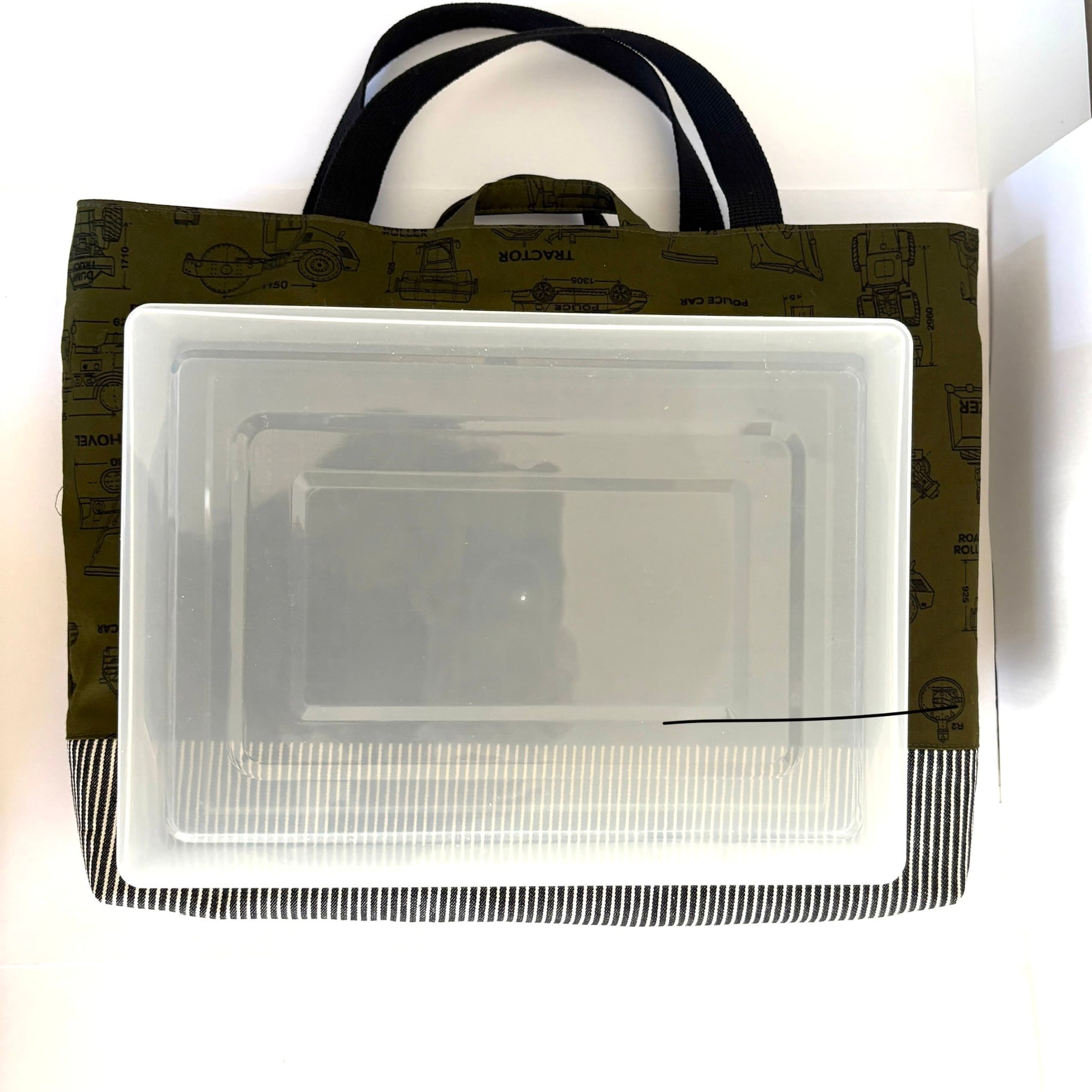 【再販可】 大きめ 働く車大好きレッスンバック ヒッコリーデニム切替 35×45 ループ付 撥水加工内布
