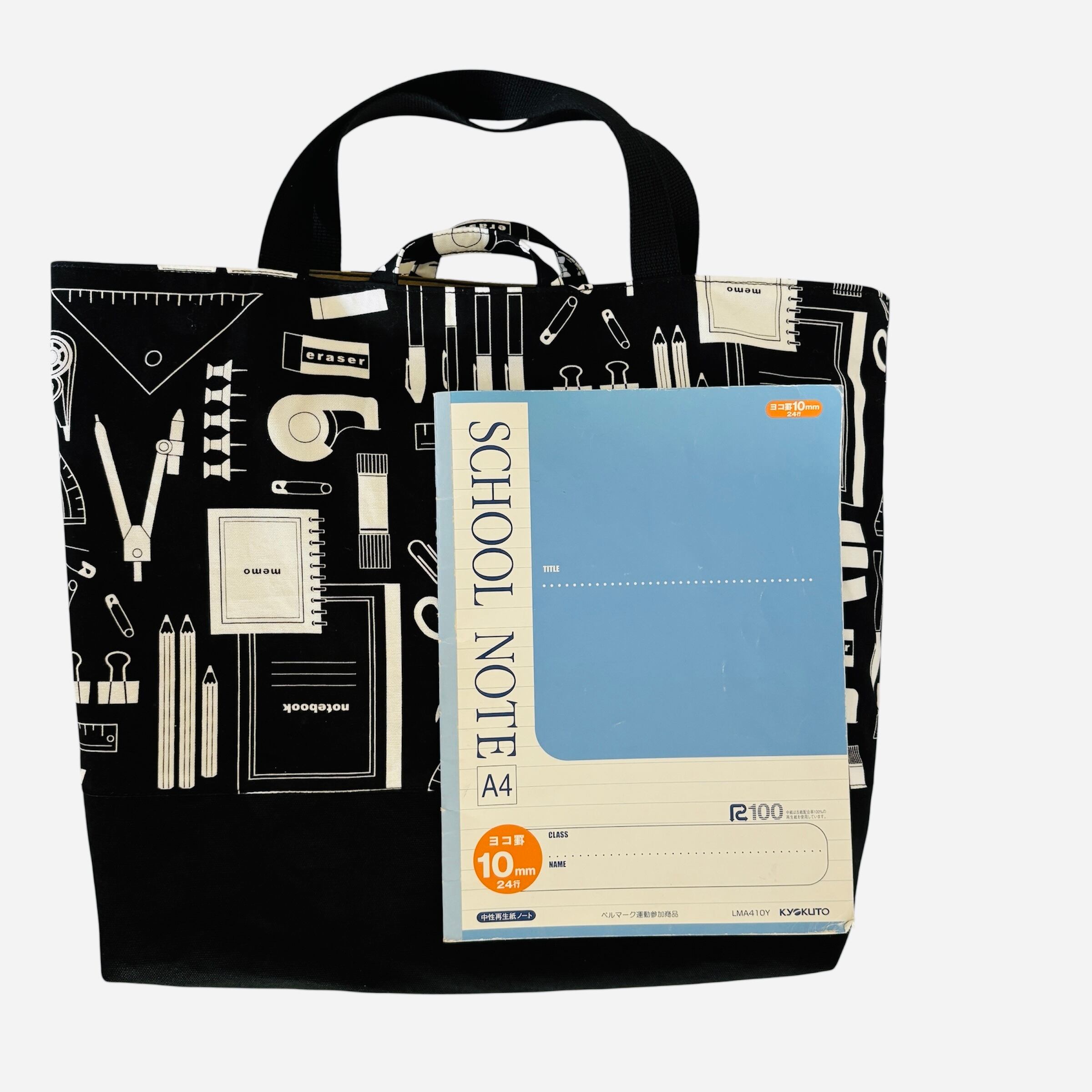 表地ブラック文房具柄オックス生地(綿100%)