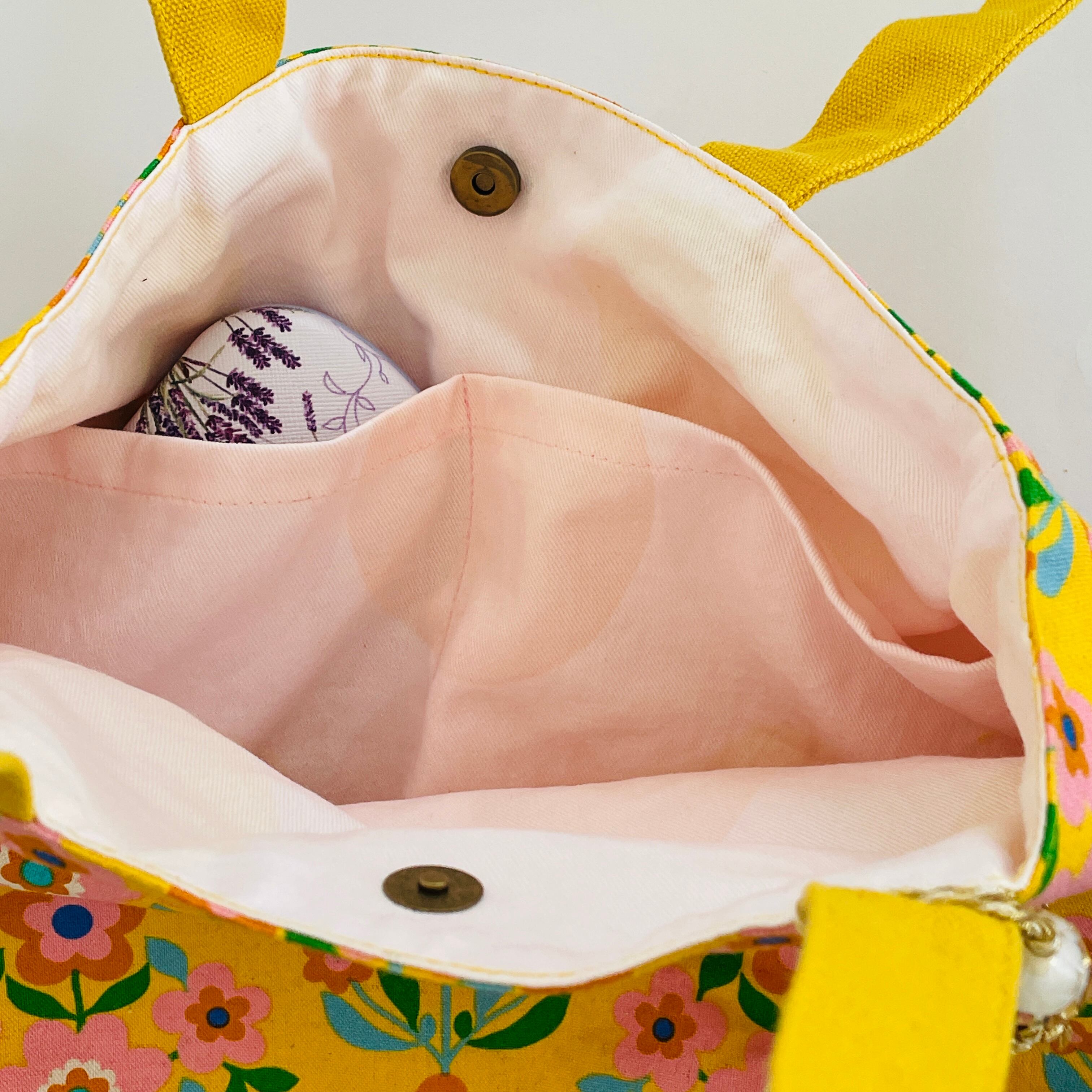 麻混の黄色のレトロフラワー柄でA4サイズも入るふっくらかわいいフォルムのダーツ入りバッグを製作しました。