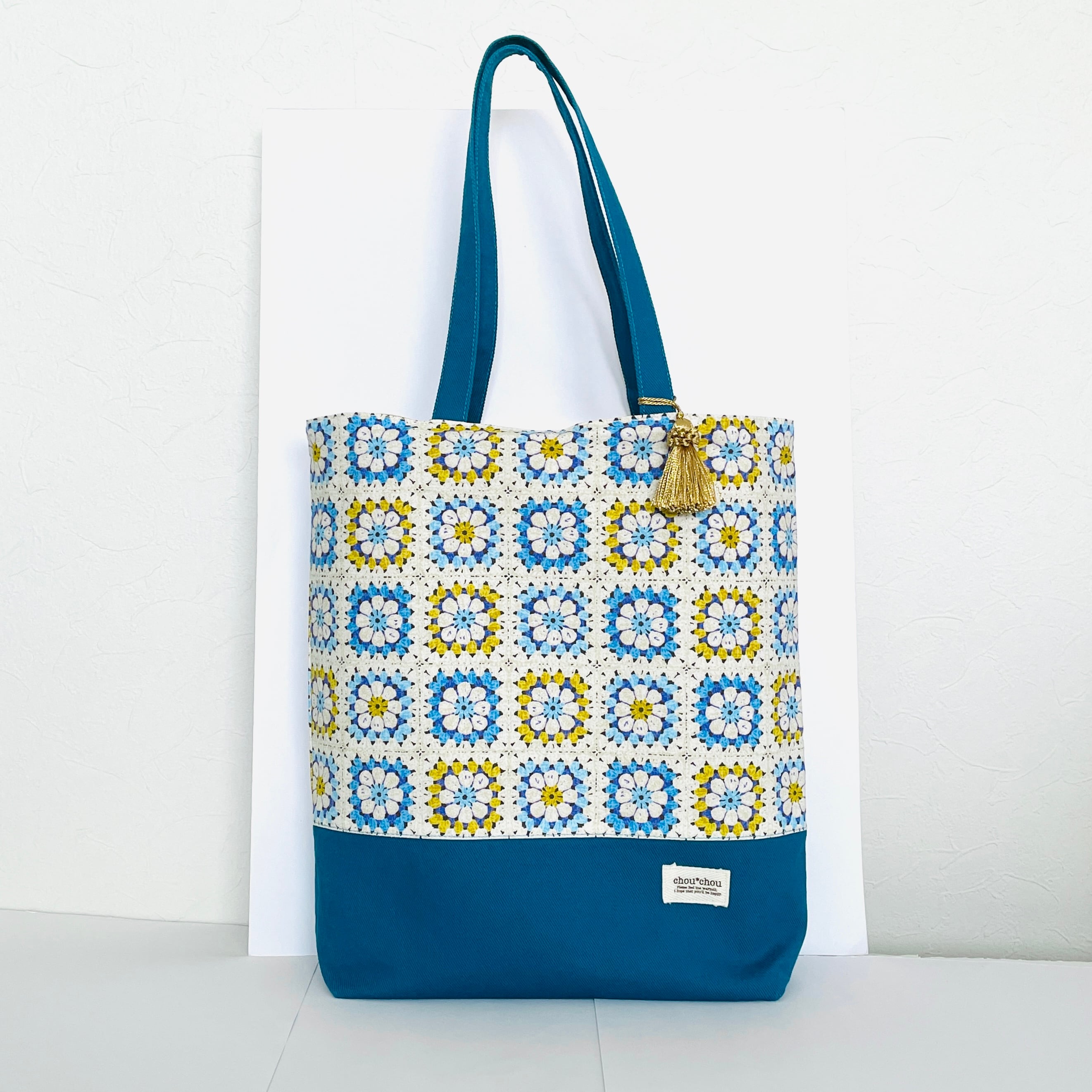 【再販可】かぎ編みモチーフ柄セルビアンブルー切替 A4 肩掛け可能トートバッグ タッセル付き