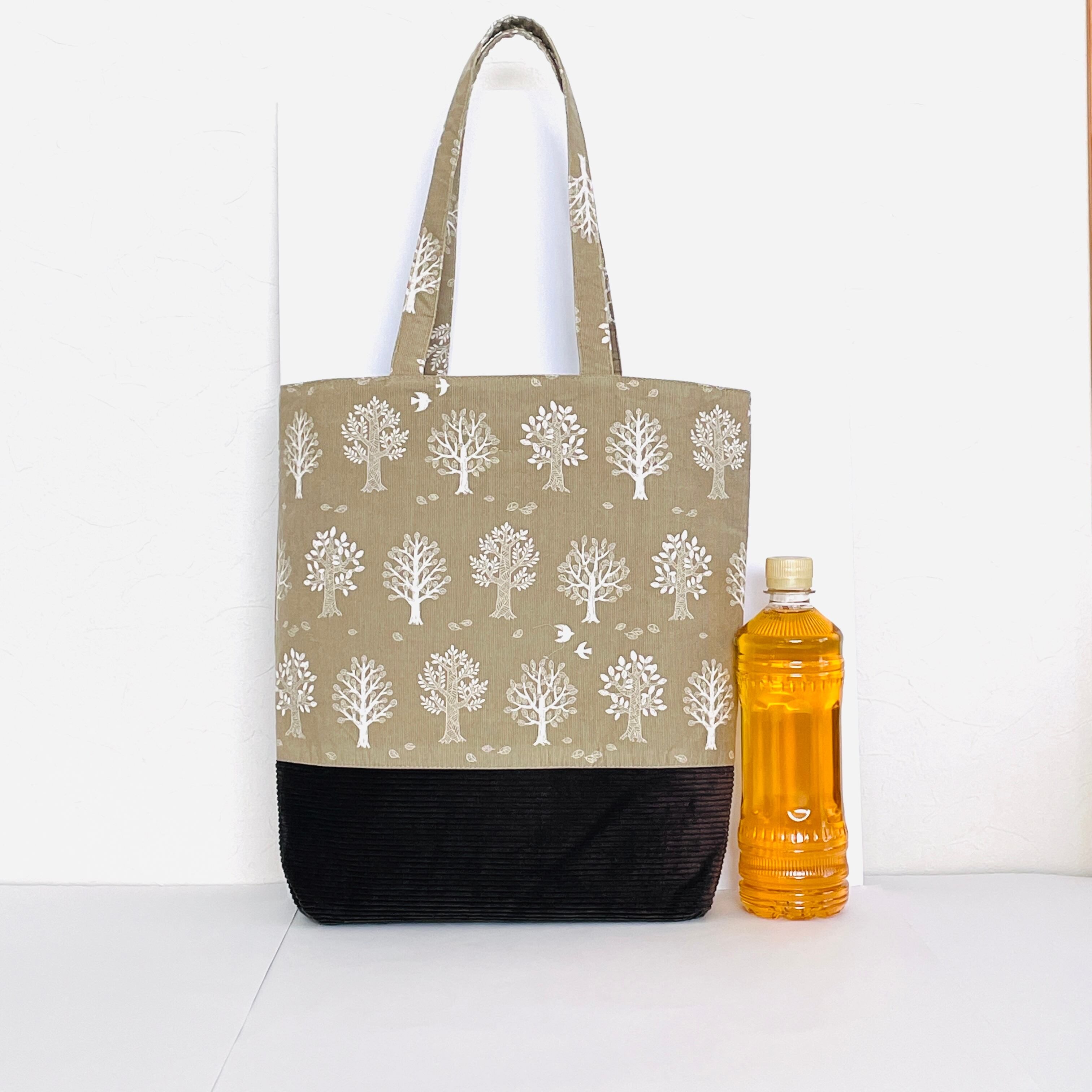 表地と持ち手、薄手の木と鳥柄 細コーデュロイベージュ生地(綿100%表地)