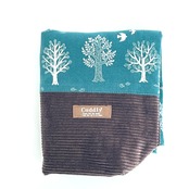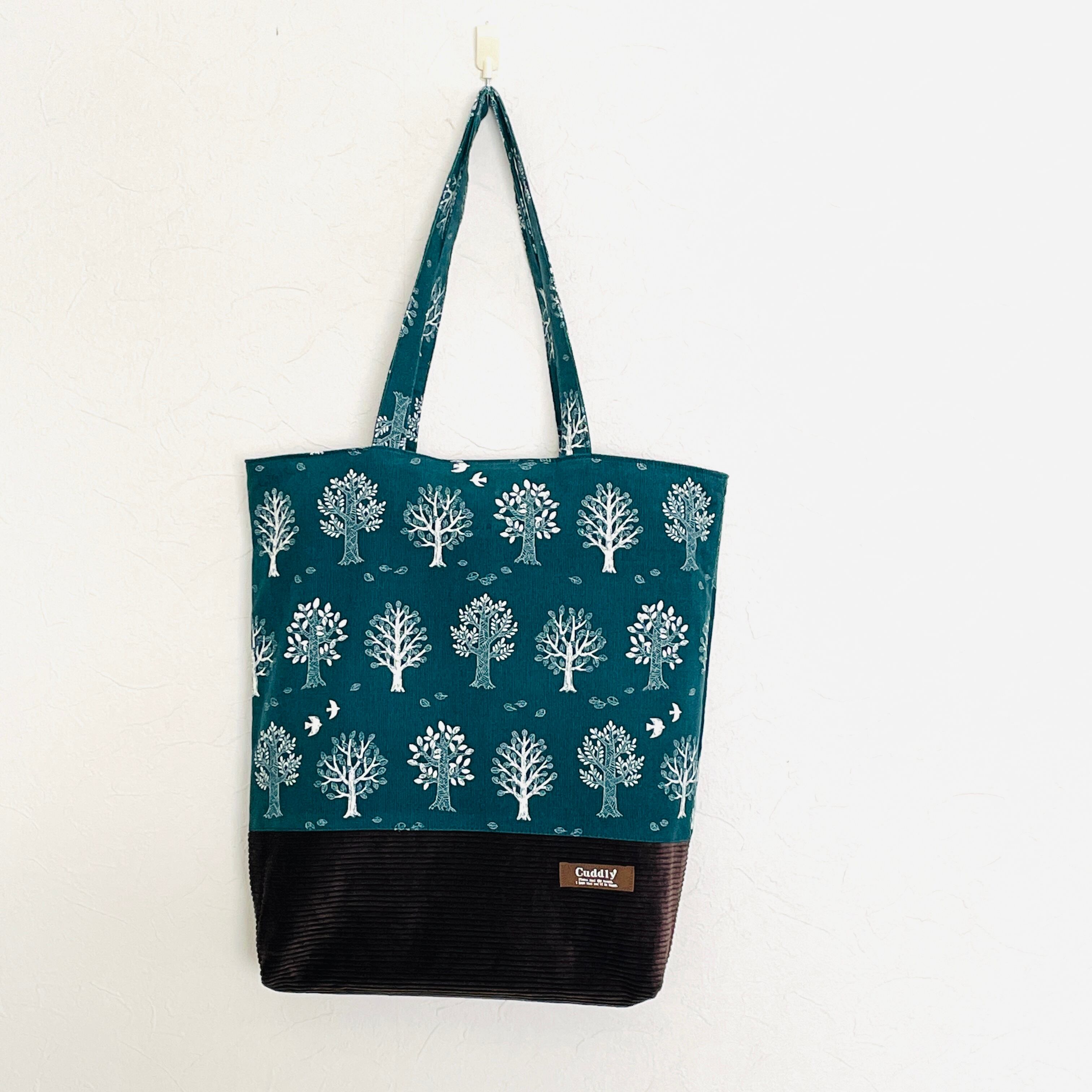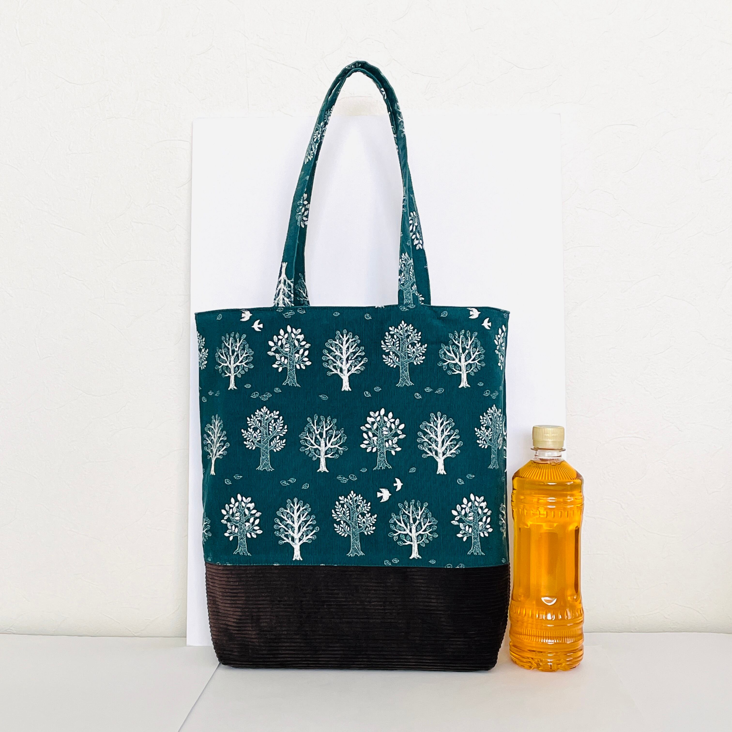 表地と持ち手、薄手木と鳥柄の細コーデュロイ深緑生地(綿100%表地)