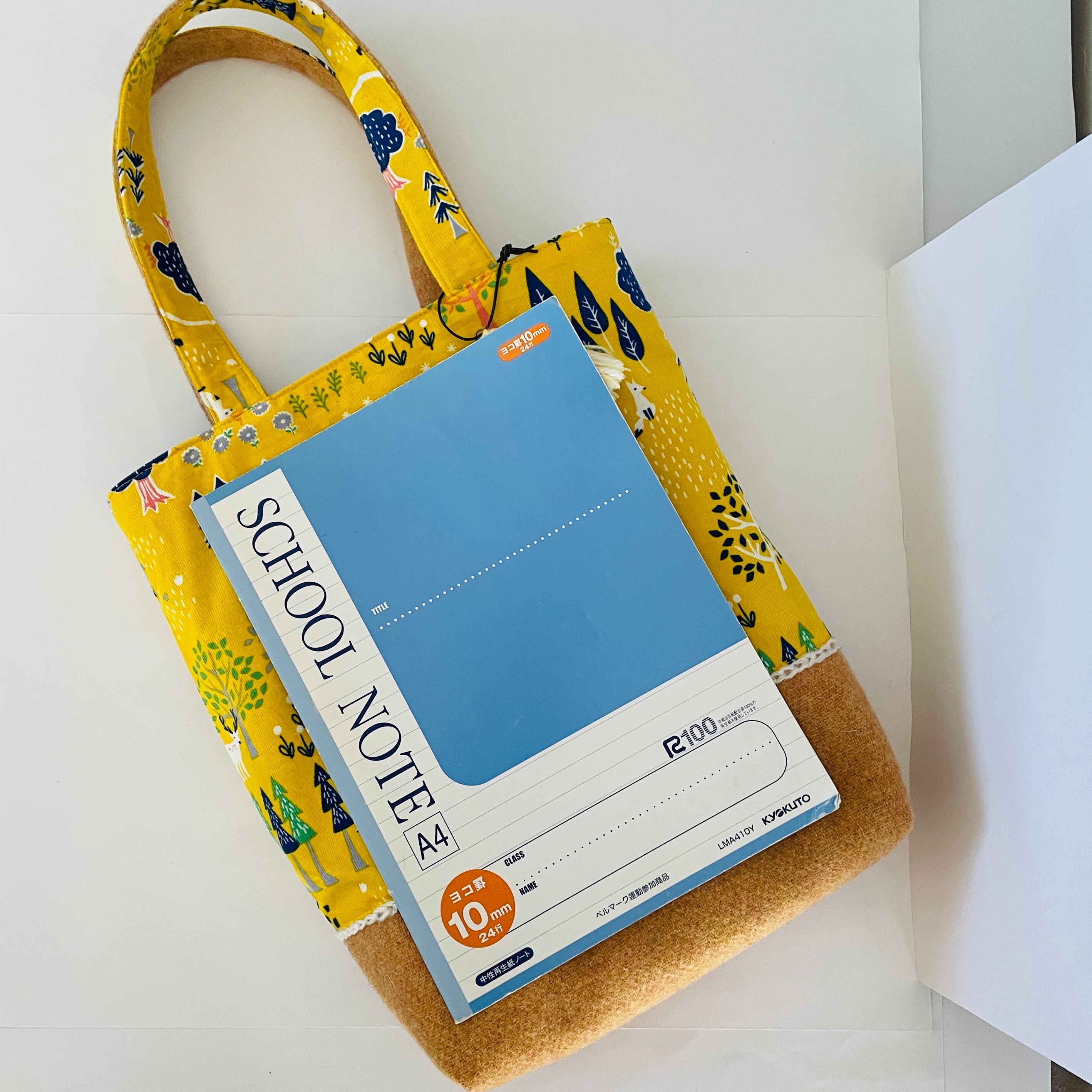 【再販可】北欧の森柄 A4 トートバッグ 肩掛け可能 イエロー マグネットボタン、タッセル付 ステッチ2