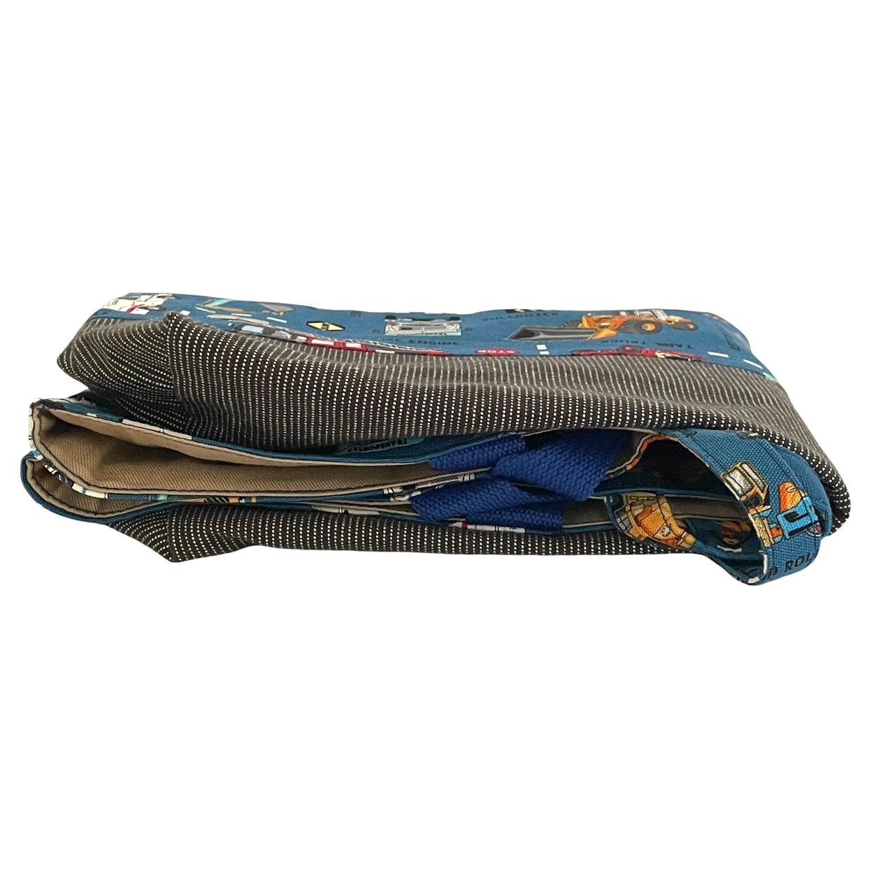 落ち着いたブルーに、タンクローリー、ブルドーザー、パトカー、ミックスカー、ロードローラー等、まちで働きものの、車がズラリと描かれています。